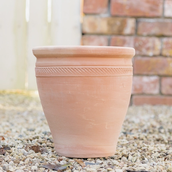 Please Note: These pots come in 3 assorted designs as pictured and we will choose a design to deliver based on our current stocks. Where 2 or more pots are ordered, we will do our best to deliver all of them in the same design. Terracotta is a natural product and some colour variation may occur between pots.