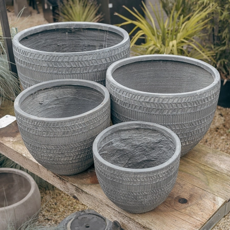 Lightweight, Fibre-Clay Round Pots available in 4 sizes. All pots include a drainage hole.
