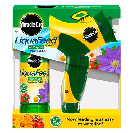 Miracle-Gro LiquaFeed All Purpose Plant Food. Now feeding is as easy as watering! Miracle-Gro LiquaFeed plant feeding system contains a trigger locking mechanism for a continuous spray. The Starter Kit contains 4-spray patterns: jet, shower, flat and stream and a feeder unit and one refill bottle. Refill bottles are also available individually.