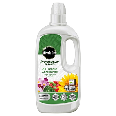 High-performance organic liquid plant food that grows plants twice as big. Performance Organics from Miracle-Gro is the breakthrough range of 100% natural gardening products that still grows twice as big, but organically. Miracle-Gro Performance Organics All Purpose Liquid Concentrate is a high-performance 100% natural and organic liquid plant food that is glorious on plants but gentle on nature. Made purely from plants, this mighty feed will give you visibly healthier plants in 7 days.