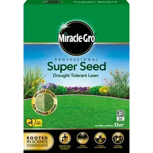 Miracle-Gro® Professional Super Seed for Drought Tolerant Lawns is a lawn seed especially developed for lawns that remains green with 30 percent less water compared to standard grass seeds.