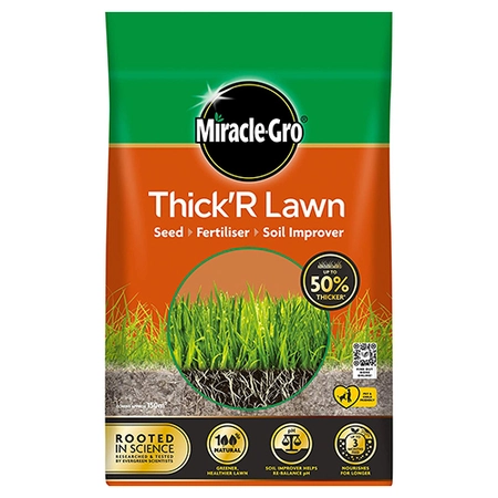 Miracle-Gro Thick’R Lawn is a unique combination of Grass Seed, Fertiliser and Soil Improver that will help you grow thick, beautiful grass. One application gives a 50% thicker lawn in a month (actual results may vary based on starting conditions of lawn) and feeds for up to 3 months. 100% natural. Child and pet friendly. Packaging is recyclable and includes 40% recycled plastic.