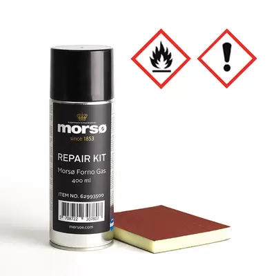 Maintenance of Morsø Forno Gas Product Series. The lid and pan of the Morsø Forno Gas BBQ are in precision-cast aluminium, whereas the cooking grate is made of sturdy enamel-coated cast iron. The materials have been carefully selected in order to provide you with good cooking experiences with your new BBQ, which, at the same time, also needs to be easy to clean. For everyday cleaning, the cast-aluminum surfaces can be wiped with a damp cloth or washed with a mild solution of soft soap when the grill is cold. Preferable use demineralized water, as ordinary water can leave limescale. The surface can, however, become slightly oxidized and grey in colour over time, but it can easily be revitalized with The Morsø Repair Kit for outdoor use. Always wear a protective mask to avoid inhaling the paint! Patina will eventually appear on all outdoor products! When the surface fades or scratches occur, it can be gently cleaned with the enclosed fine sand paper/emery paper. Make sure the surface is totally clean and dry before applying a new, thin layer of the Morsø Forno Gas Repair Paint. To preserve your Morsø Outdoor products, we recommend the Morsø Forno Gas covers when not in use and storing them in a dry place (indoors) over the winter period. The set consists of 1 abrasive sponge, grain 180 and 400 ml heat-resistant spray paint.
