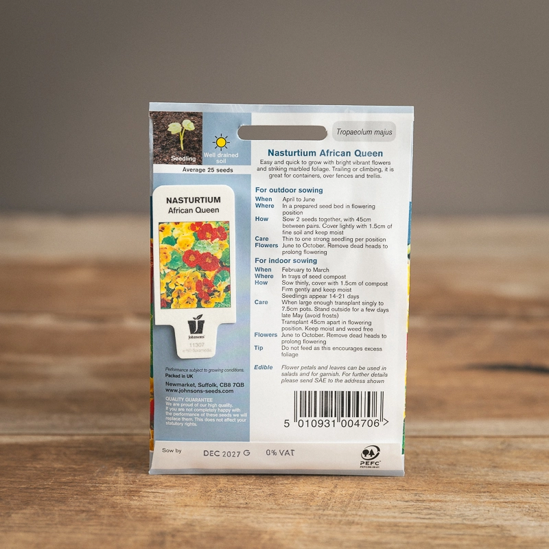 Are you looking for the product "Nasturtium African Queen"? We offer Johnsons Seeds products in our garden centers in Donaghadee, Bushmills, Galgorm and Logwood. You can also order the product "Nasturtium African Queen" online for £ 3.49 or check the products in Seeds & Bulbs. We look forward to seeing you soon!