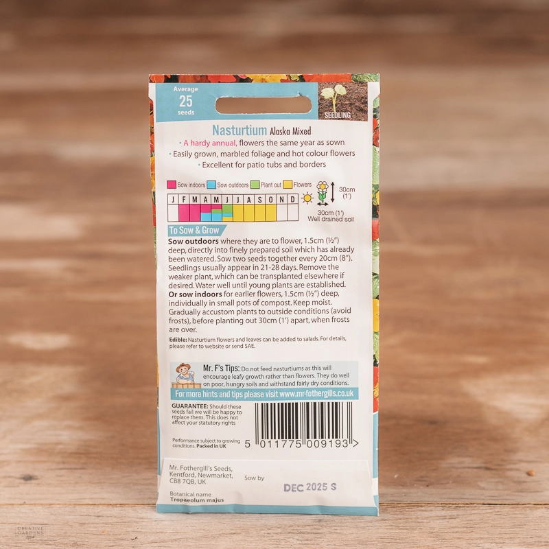 Are you looking for the product "Nasturtium Alaska Mix"? We offer Fothergills Seeds products in our garden centers in Donaghadee, Bushmills, Galgorm and Logwood. You can also order the product "Nasturtium Alaska Mix" online for £ 3.19 or check the products in Seeds & Bulbs. We look forward to seeing you soon!