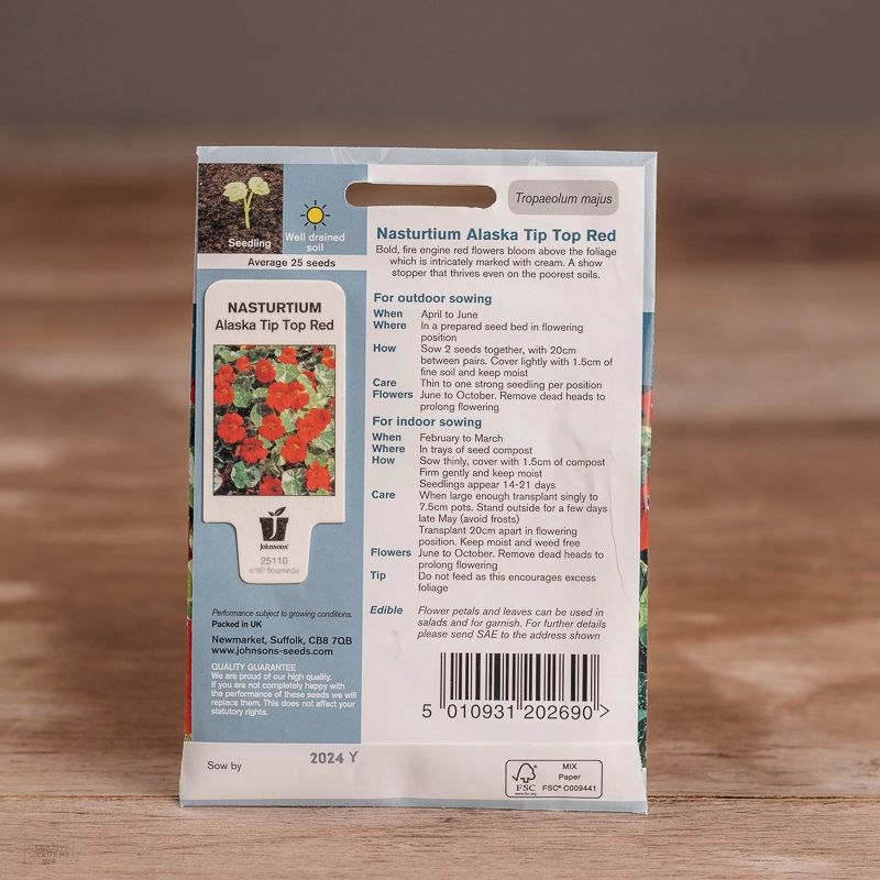 Are you looking for the product "Nasturtium Alaska Tip Top Red"? We offer Johnsons Seeds products in our garden centers in Donaghadee, Bushmills, Galgorm and Logwood. You can also order the product "Nasturtium Alaska Tip Top Red" online for £ 3.49 or check the products in Seeds & Bulbs. We look forward to seeing you soon!