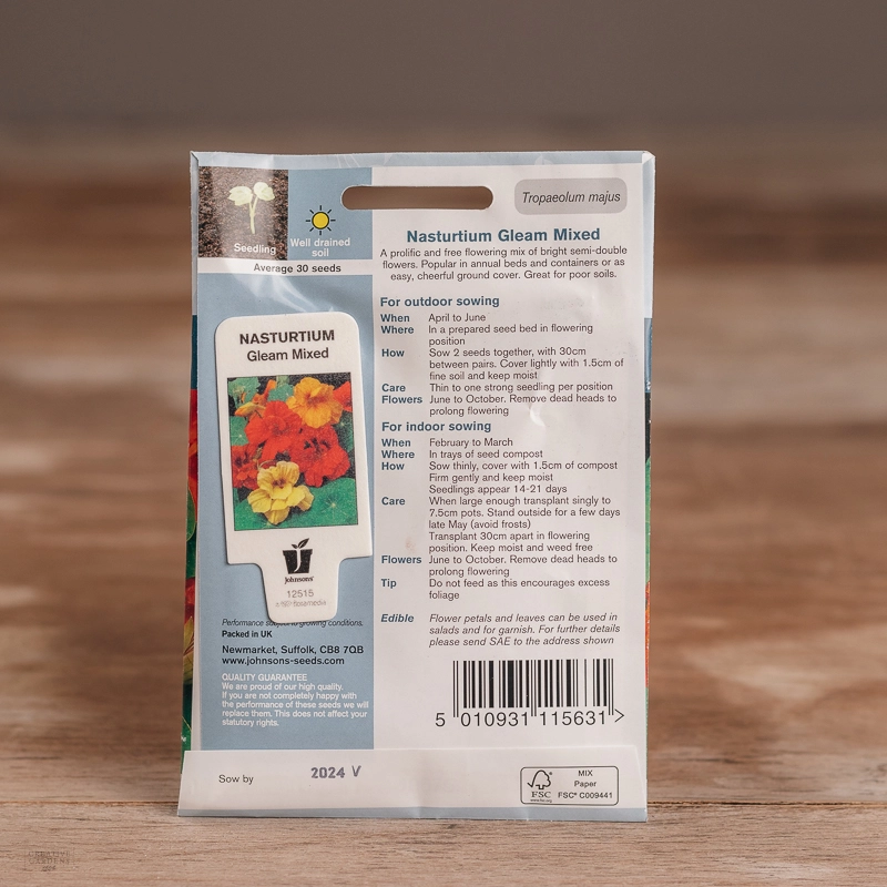 Are you looking for the product "Nasturtium Gleam Mix"? We offer Johnsons Seeds products in our garden centers in Donaghadee, Bushmills, Galgorm and Logwood. You can also order the product "Nasturtium Gleam Mix" online for £ 3.19 or check the products in Seeds & Bulbs. We look forward to seeing you soon!