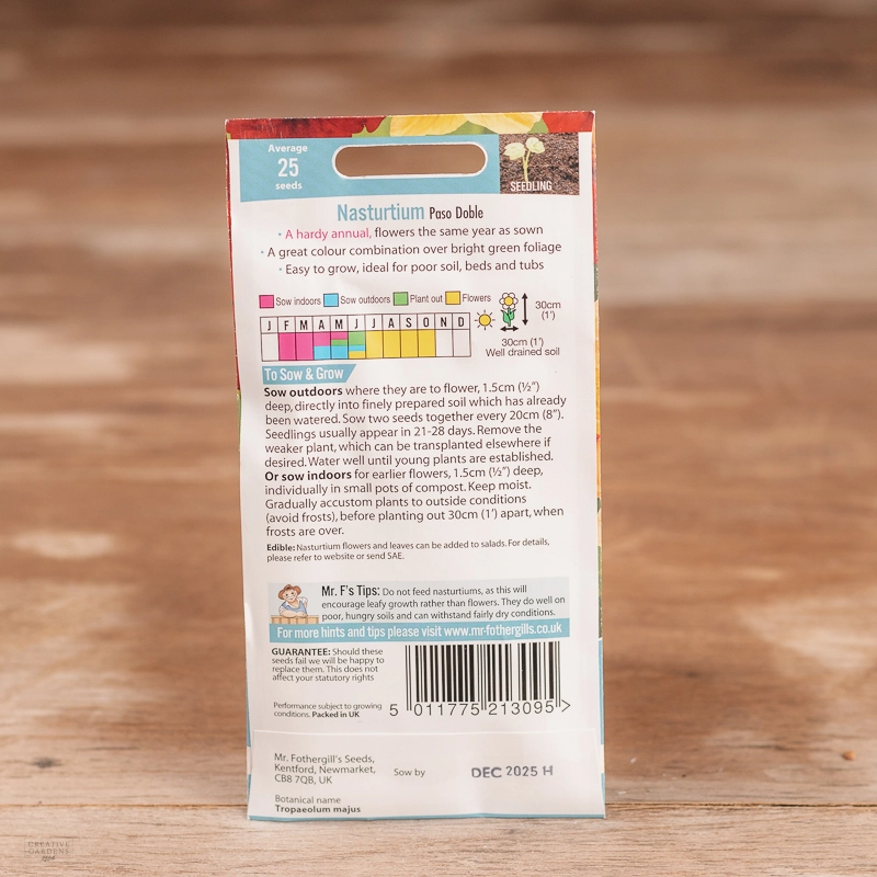Are you looking for the product "Nasturtium Paso Doble"? We offer Fothergills Seeds products in our garden centers in Donaghadee, Bushmills, Galgorm and Logwood. You can also order the product "Nasturtium Paso Doble" online for £ 3.19 or check the products in Seeds & Bulbs. We look forward to seeing you soon!