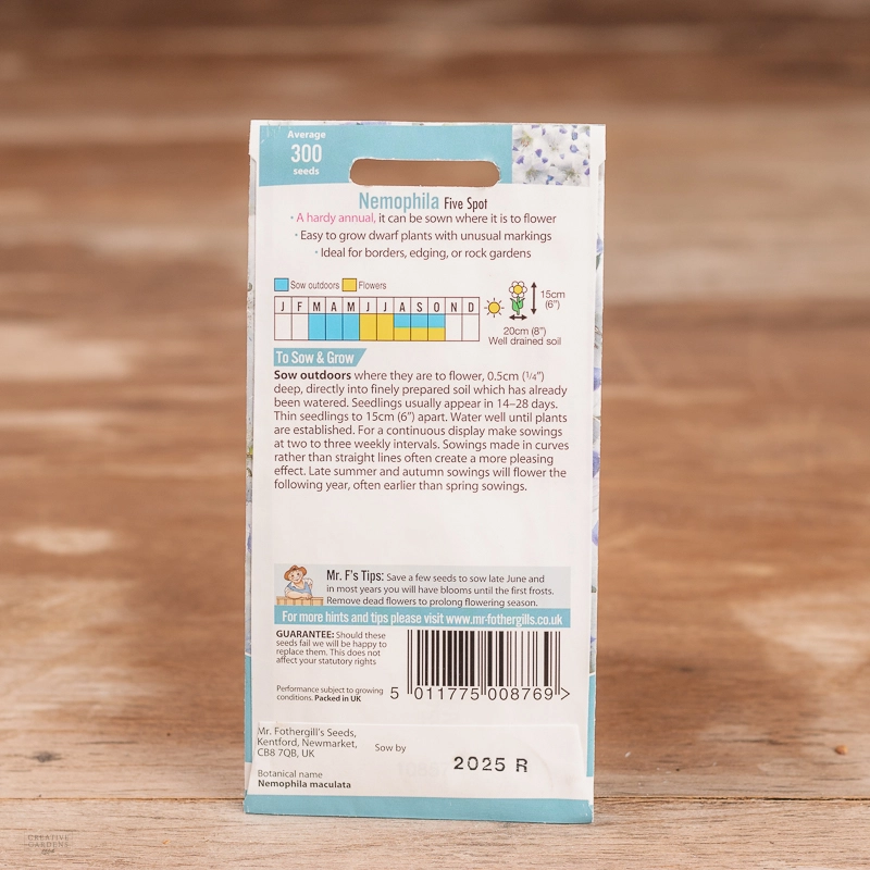 Are you looking for the product "Nemophila Five Spot"? We offer Fothergills Seeds products in our garden centers in Donaghadee, Bushmills, Galgorm and Logwood. You can also order the product "Nemophila Five Spot" online for £ 2.99 or check the products in Seeds & Bulbs. We look forward to seeing you soon!