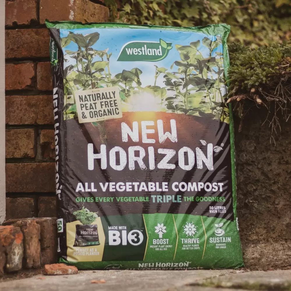 Our New Horizon All Vegetable Compost is a naturally peat free formulation that gives your vegetables triple the goodness. It has a perfect blend of Biofibre combined with West+ as well as Coir+ to give fruits and vegetables every reason to thrive. You can also combine this compost with top soil to create raised beds and borders for vegetable patches.