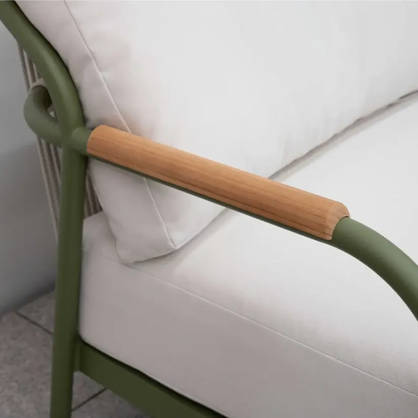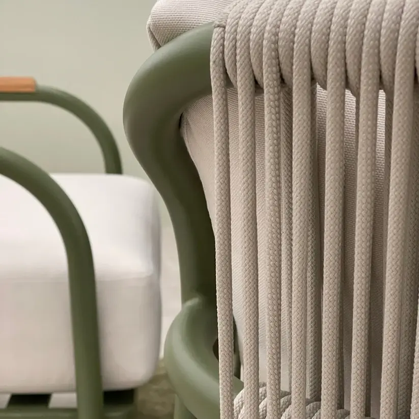 The generously sized lounge armchairs offer exceptional comfort, while the vertical rope detailing on the chair backs adds both textural interest and supportive structure. Beautiful teak accents enhance the design with a warm, organic touch, effortlessly tying in with garden greenery. Whether you’re relaxing with a drink or entertaining friends, the Ashley Collection delivers elegance and functionality in equal measure.