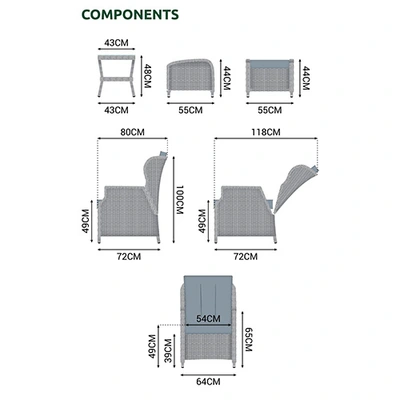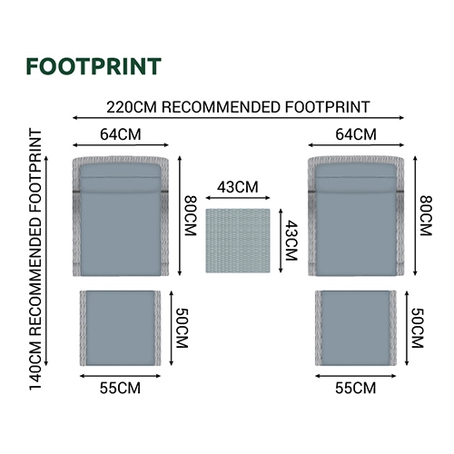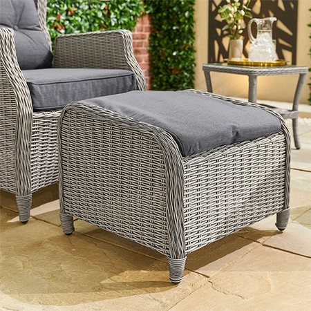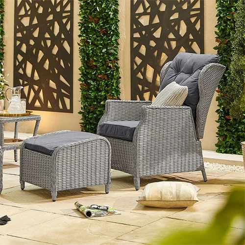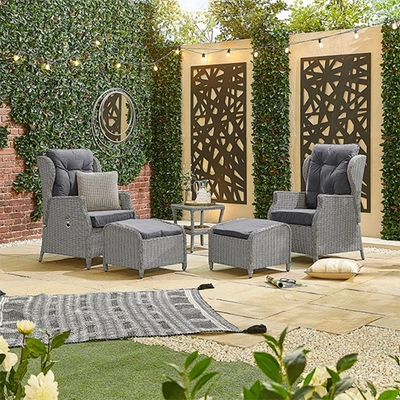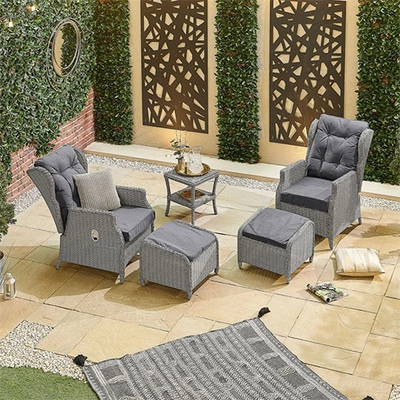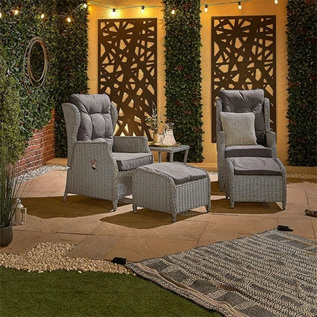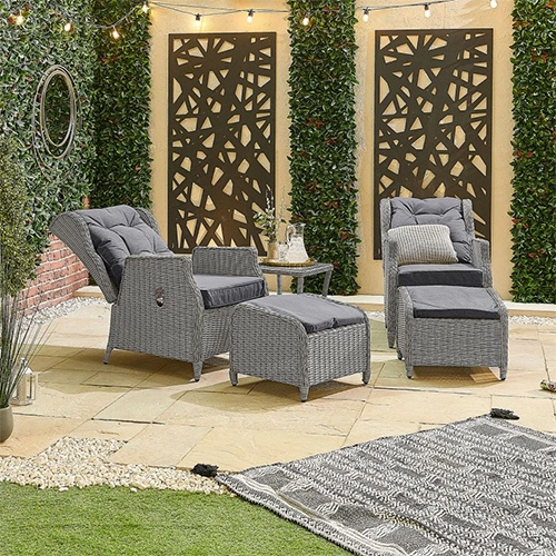 This lounge set combines 2 reclining armchairs with 2 padded footstools and a small coffee table, ideal for relaxing with a partner in the garden with drinks and snacks. The reclining chairs and footstools allow you to truly relax and unwind with your feet up. The chairs are controlled by a lever on the side which allows you to adjust the back of the chair to multiple positions.