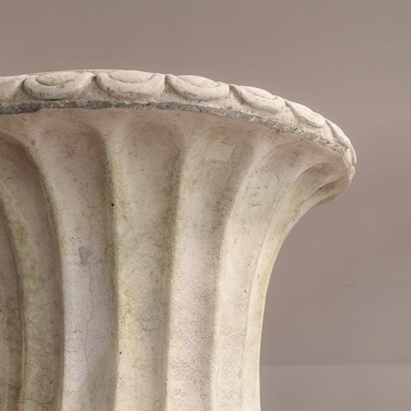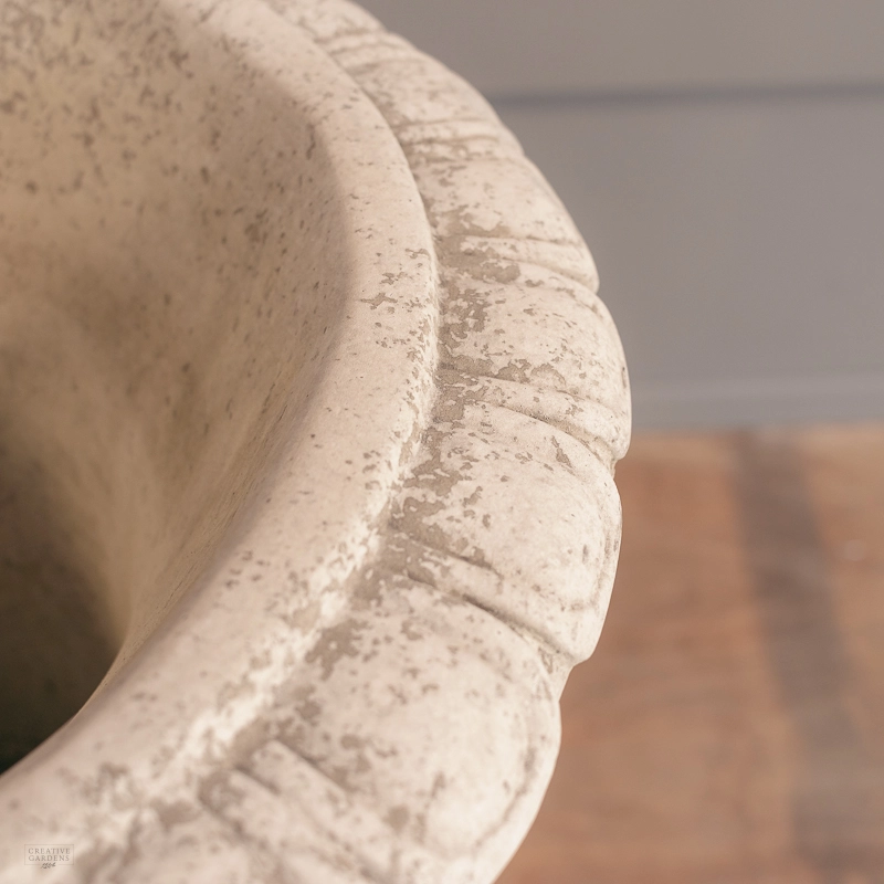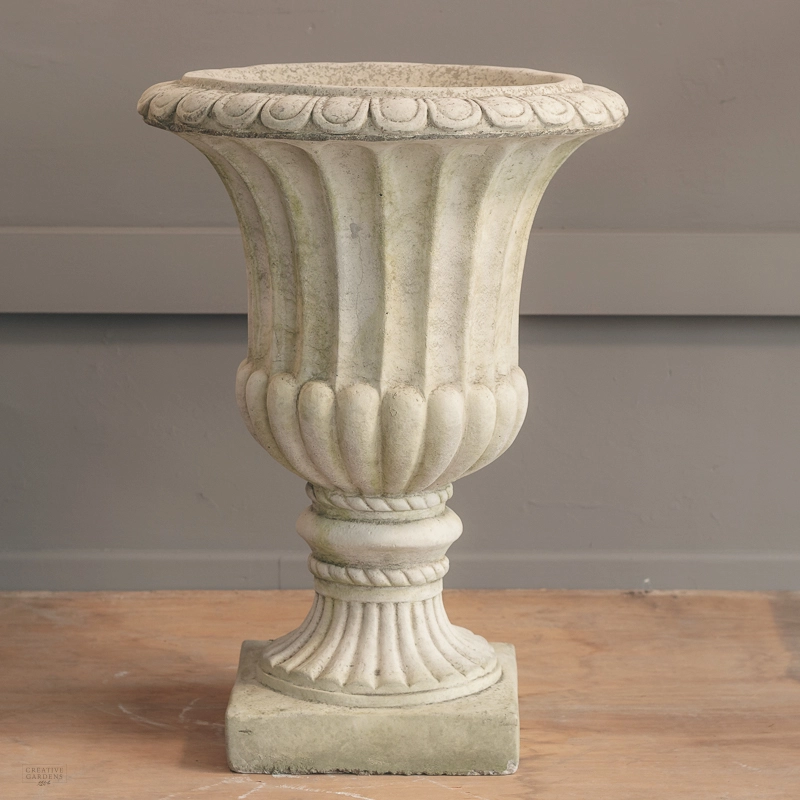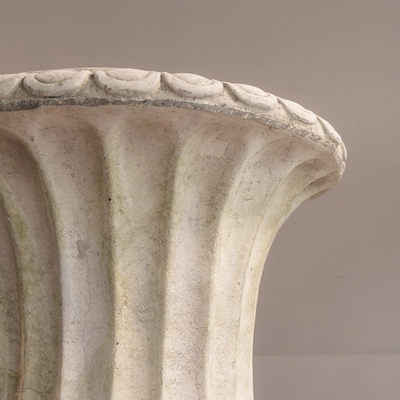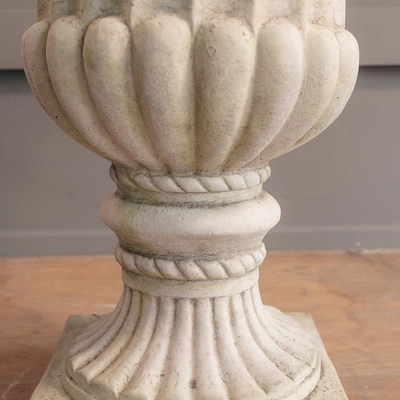 Large Ribbed Concrete Vase with a Fluted Shape and Square Base. Vase includes drainage hole at the bottom.