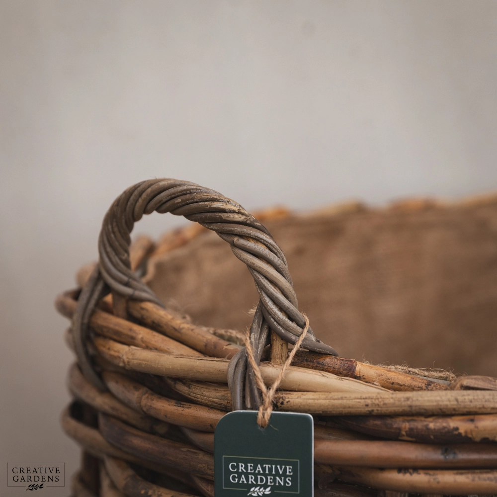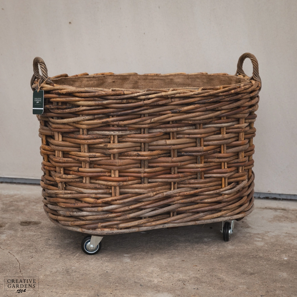Wicker Wheeled Oval Basket with Eared Handles & Hessian Liner