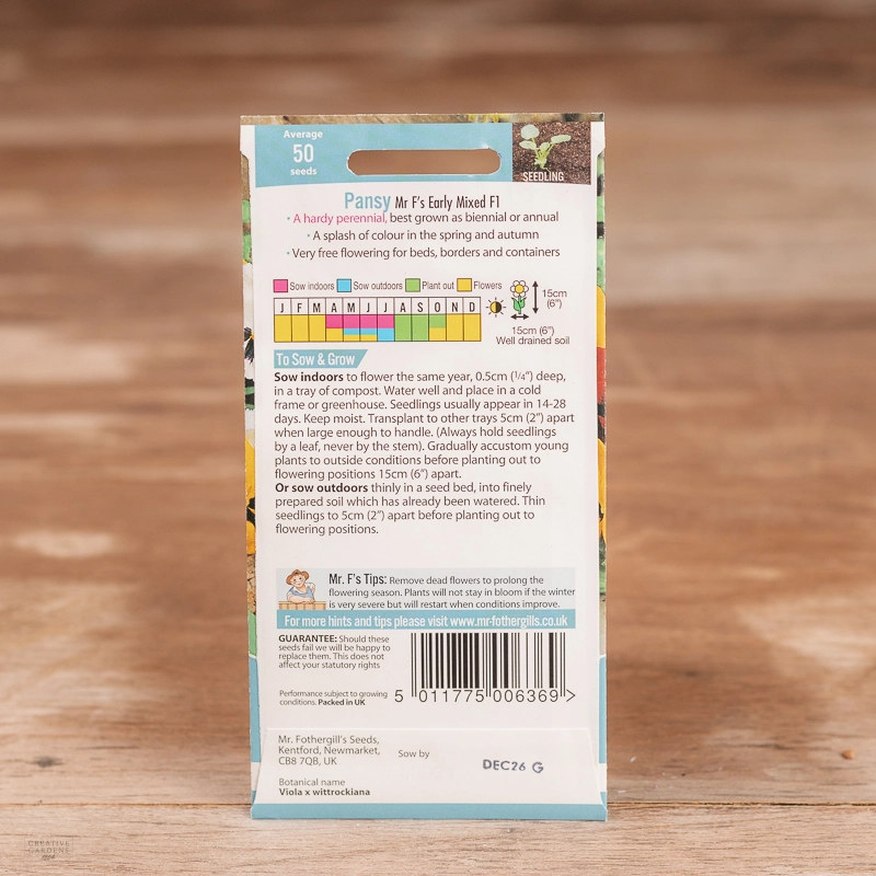 Are you looking for the product "Pansy Mr F'S Early Mix F1"? We offer Fothergills Seeds products in our garden centers in Donaghadee, Bushmills, Galgorm and Logwood. You can also order the product "Pansy Mr F'S Early Mix F1" online for £ 3.99 or check the products in Seeds & Bulbs. We look forward to seeing you soon!