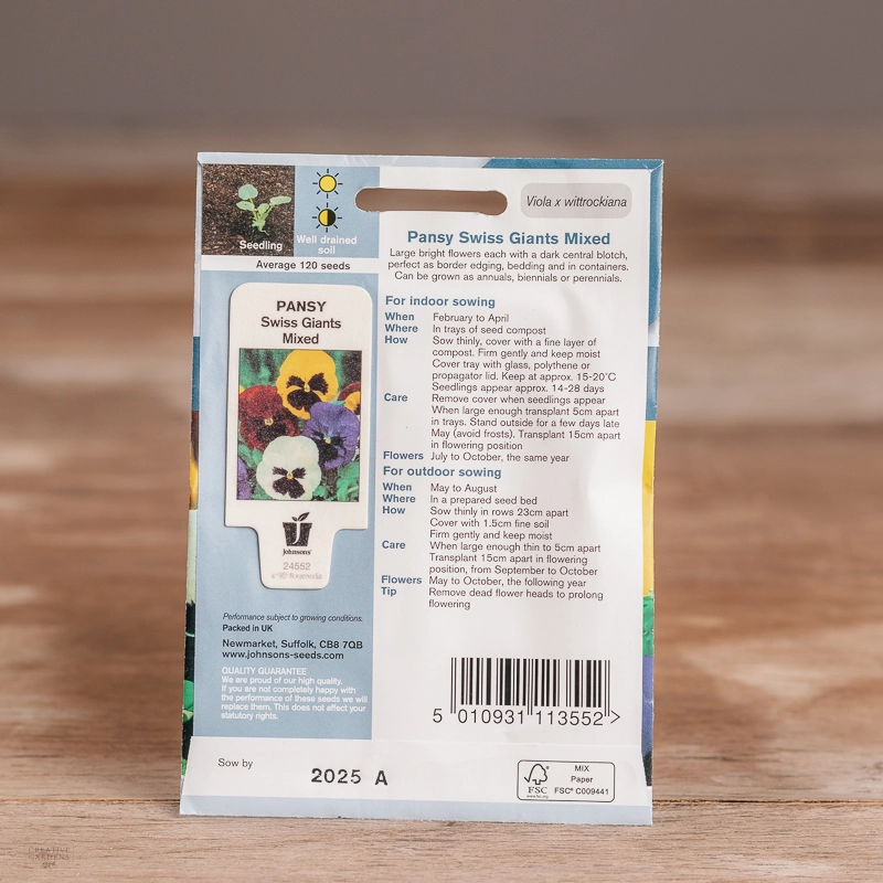 Are you looking for the product "Pansy Swiss Giants Mix"? We offer Johnsons Seeds products in our garden centers in Donaghadee, Bushmills, Galgorm and Logwood. You can also order the product "Pansy Swiss Giants Mix" online for £ 3.19 or check the products in Seeds & Bulbs. We look forward to seeing you soon!