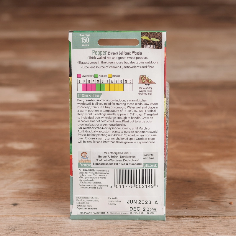 Are you looking for the product "Pepper (Sweet) California Wonder"? We offer Fothergills Seeds products in our garden centers in Donaghadee, Bushmills, Galgorm and Logwood. You can also order the product "Pepper (Sweet) California Wonder" online for £ 3.19 or check the products in Seeds & Bulbs. We look forward to seeing you soon!