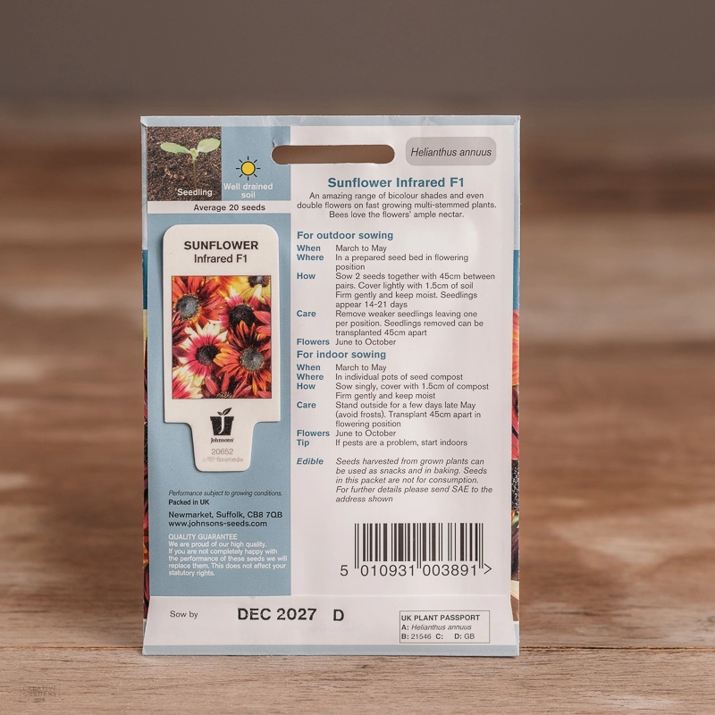 Are you looking for the product "Sunflower Infrared F1"? We offer Johnsons Seeds products in our garden centers in Donaghadee, Bushmills, Galgorm and Logwood. You can also order the product "Sunflower Infrared F1" online for £ 3.49 or check the products in Seeds & Bulbs. We look forward to seeing you soon!