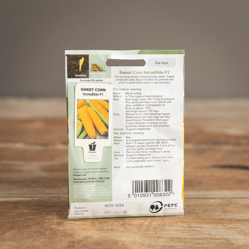 Are you looking for the product "Sweet Corn Incredible F1"? We offer Johnsons Seeds products in our garden centers in Donaghadee, Bushmills, Galgorm and Logwood. You can also order the product "Sweet Corn Incredible F1" online for £ 3.49 or check the products in Seeds & Bulbs. We look forward to seeing you soon!