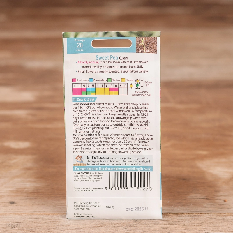 Are you looking for the product "Sweet Pea Cupani (Grandiflora)"? We offer Fothergills Seeds products in our garden centers in Donaghadee, Bushmills, Galgorm and Logwood. You can also order the product "Sweet Pea Cupani (Grandiflora)" online for £ 3.19 or check the products in Seeds & Bulbs. We look forward to seeing you soon!