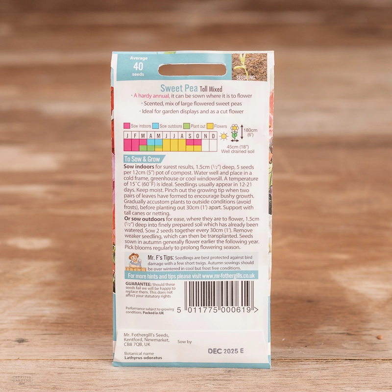 Are you looking for the product "Sweet Pea Tall Mix"? We offer Fothergills Seeds products in our garden centers in Donaghadee, Bushmills, Galgorm and Logwood. You can also order the product "Sweet Pea Tall Mix" online for £ 2.99 or check the products in Seeds & Bulbs. We look forward to seeing you soon!