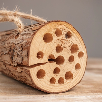 - Natural log with pre-drilled cavities to provide a habitat for nesting bees