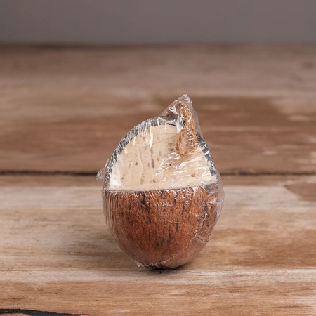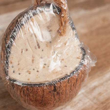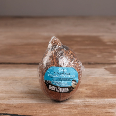 This whole mealworm coconut feeder can be hung from your tree or feeding station as a complementary snack for wild birds.