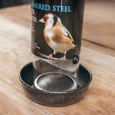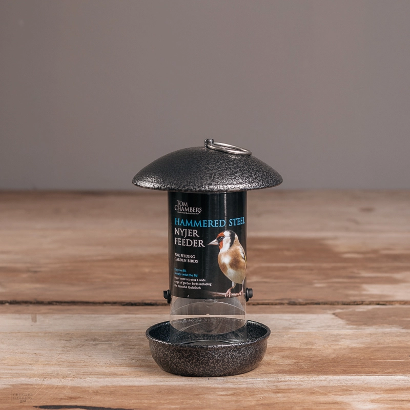 Tom Chambers Hammered Steel Nyjer Seed Feeder Attractive hammered effect coating Lid twists off for easy filling Strong perspex tube Base removes for easy cleaning