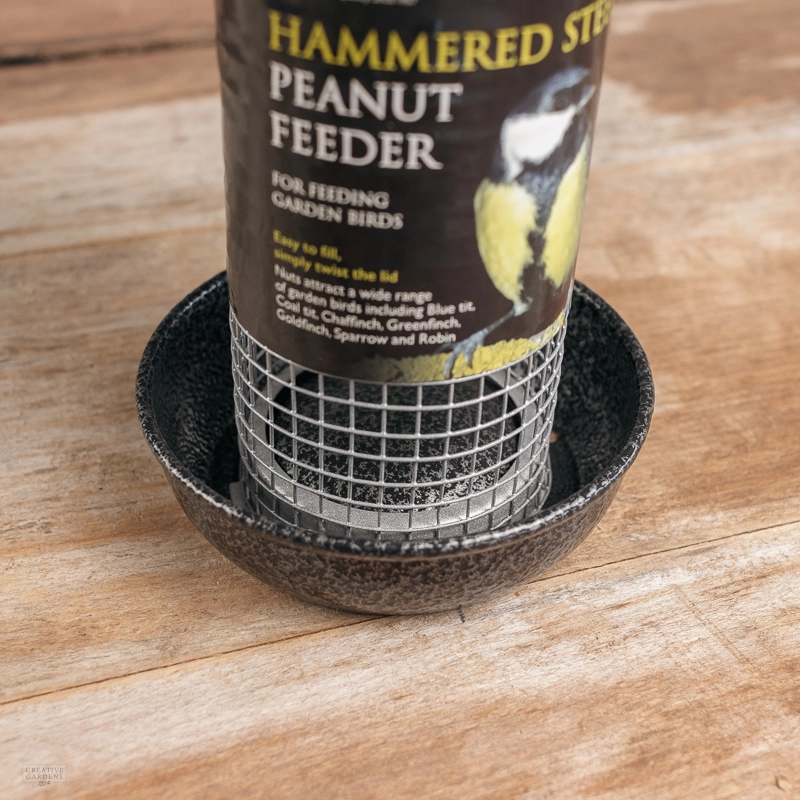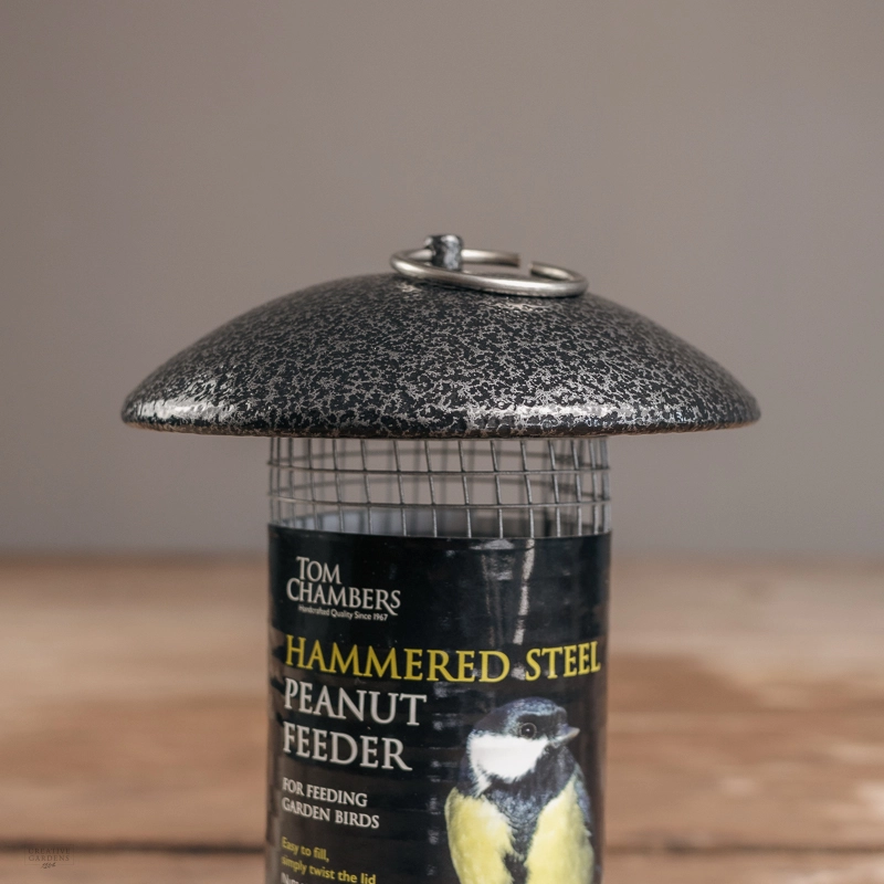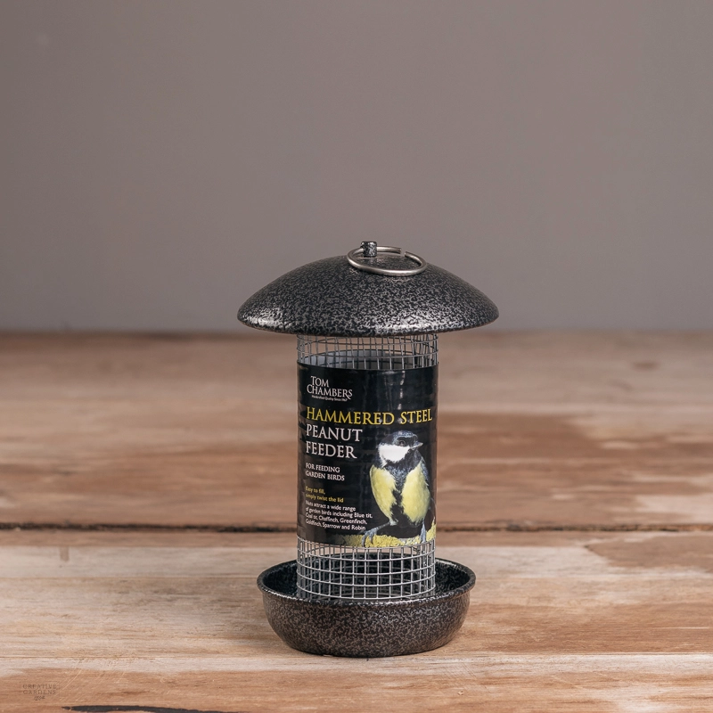 When filled with peanuts this feeder is a great way to attract a many different species of wild bird Hammered steel finish Robust metal mesh feeding tube with removable base Quick and easy to fill Height: 21cm