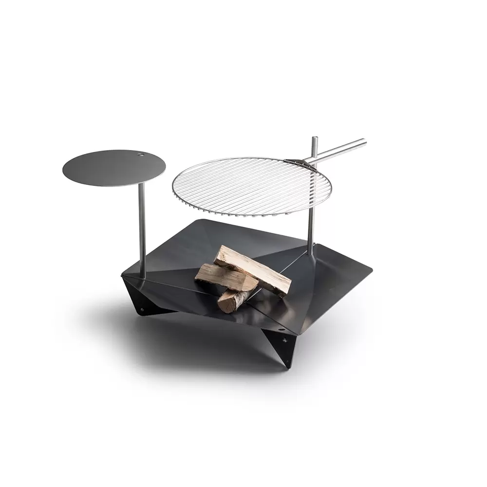 Fire bowl don’t get much better than this! Three identical, faceted segments are connected in just a few simple steps to form a hexagon. The perfect basis for the oldest form of warmth and cosiness: the open fire! With TRIPLE, you can take a campfire atmosphere anywhere. As the fire bowl is quickly disassembled, compact for transport and easy to assemble. Practical and sustainable! Love BBQs? Use the height adjustable and swivelling cooking grates for juicy steaks, tender fish and delicious veg! Cooking a fiery stew is so easy on the plancha. And the plate is a great way to keep food warm. Or for a good pot of tea, coffee, punch or mulled wine. Want a table to go with it? Simply swivel the plate outwards and serve your delicacies right by the fire!