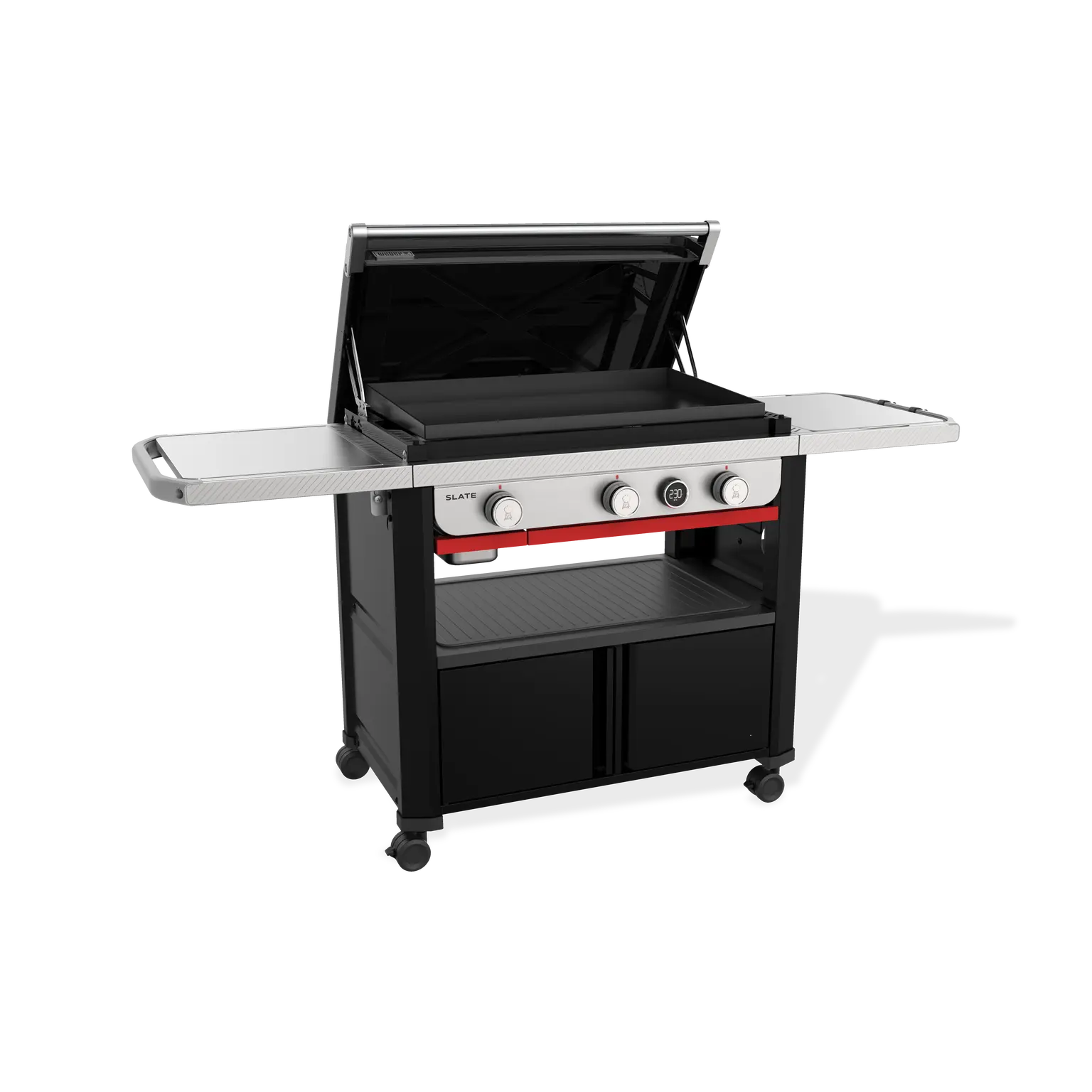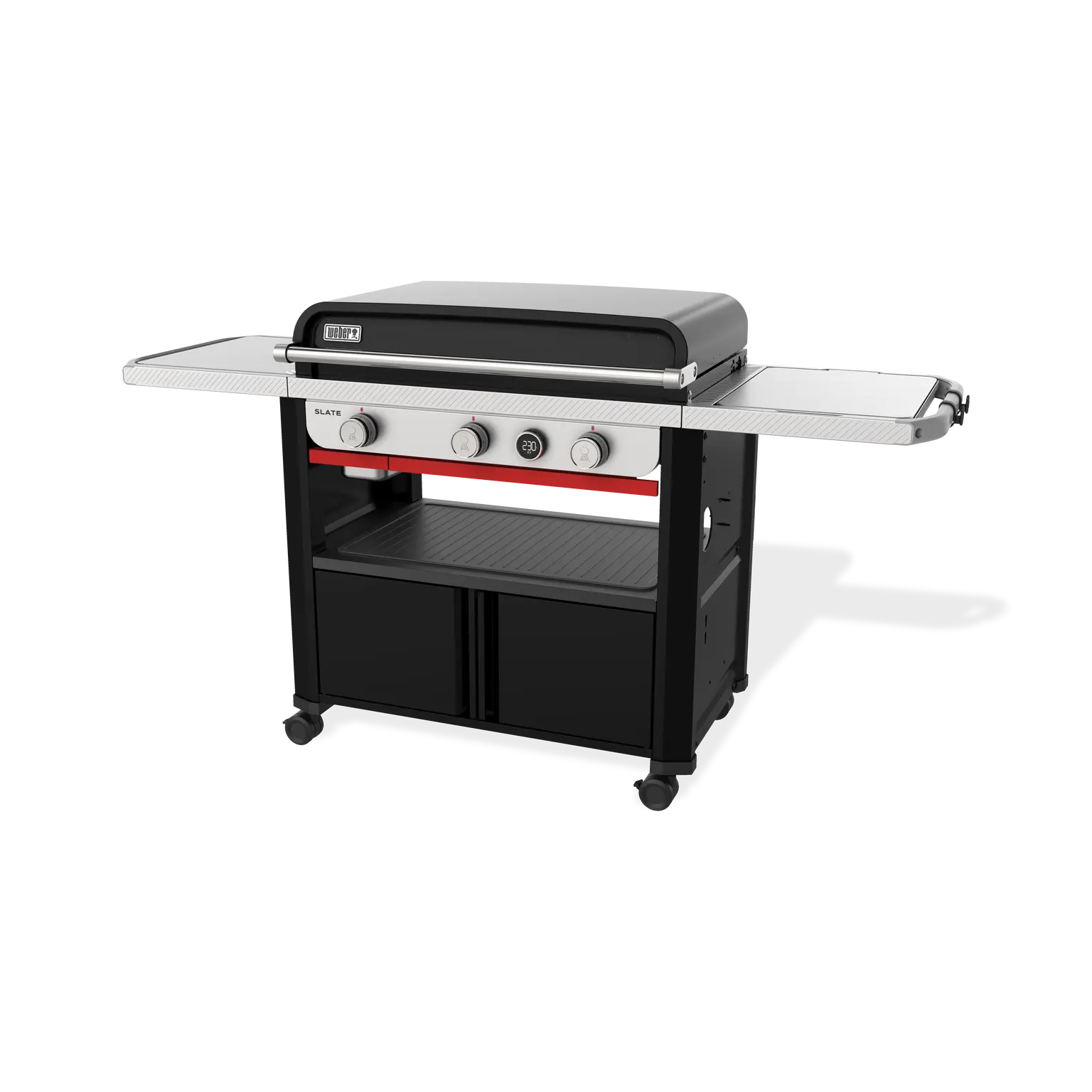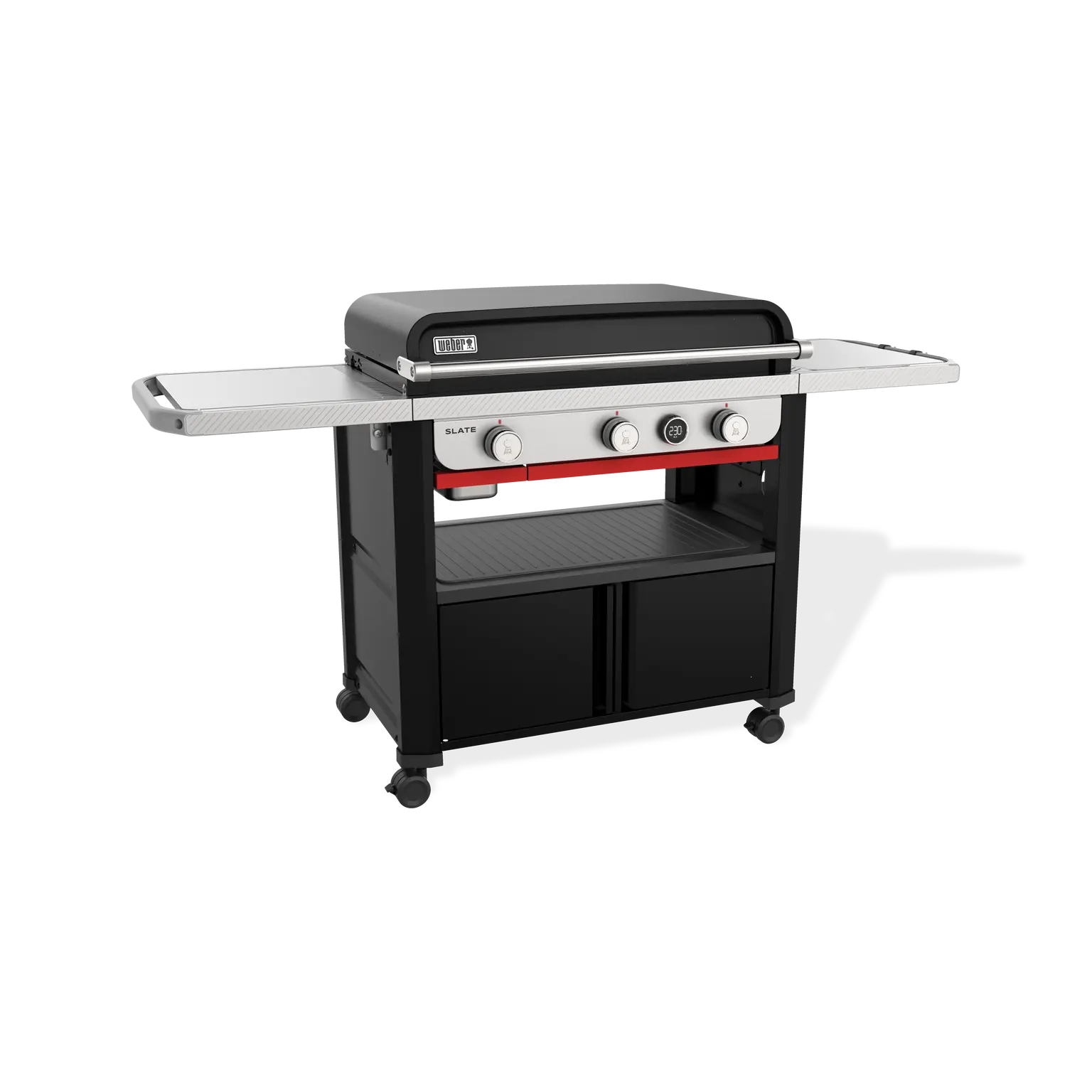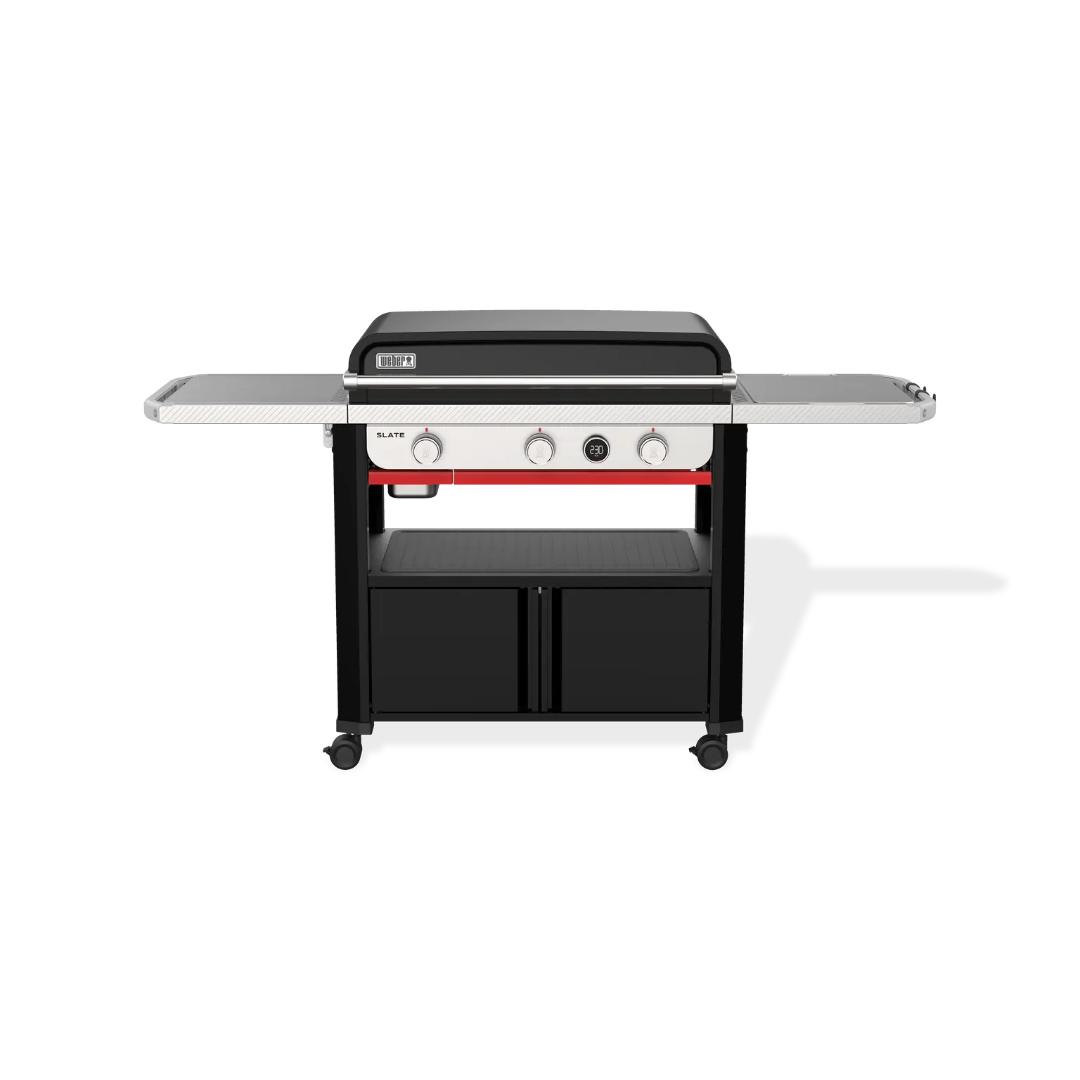 Have more fun griddling on the game changing, Weber® SLATE GPD 76 cm Premium Griddle with digital temperature display and large cooktop that reaches over 260°C and heats evenly edge-to-edge, so your food cooks consistently no matter where you place it on the griddle. Its stick-resistant, porcelain-enamel cooktop is ready to cook on right out of the box so you can create juicy smashed burgers, flavourful stir fries, beautifully seared seafood, veggies, and more. Plus, with the Weber Works Prep, Cook, and Store System you can keep cooking and cleaning supplies handy, carry food and condiments from the kitchen to the griddle, convert the side table into a prep station and stow gear in tightly sealed containers (accessories sold separately).