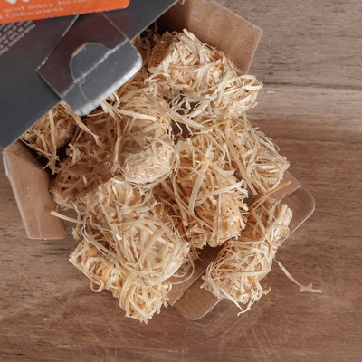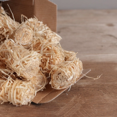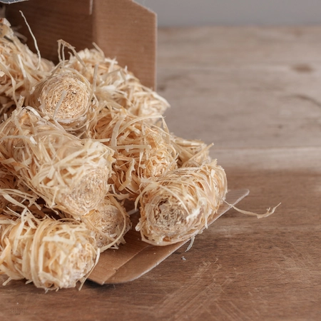 The Natural way to light your fire or BBQ. Wood shavings coated with a thin layer of wax to get your fire burning. No accelerants or nasty chemicals
