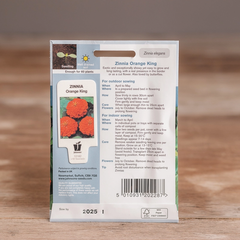 Are you looking for the product "Zinnia Orange King"? We offer Johnsons Seeds products in our garden centers in Donaghadee, Bushmills, Galgorm and Logwood. You can also order the product "Zinnia Orange King" online for £ 3.49 or check the products in Seeds & Bulbs. We look forward to seeing you soon!